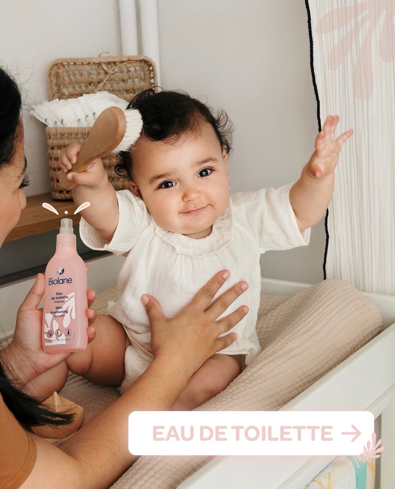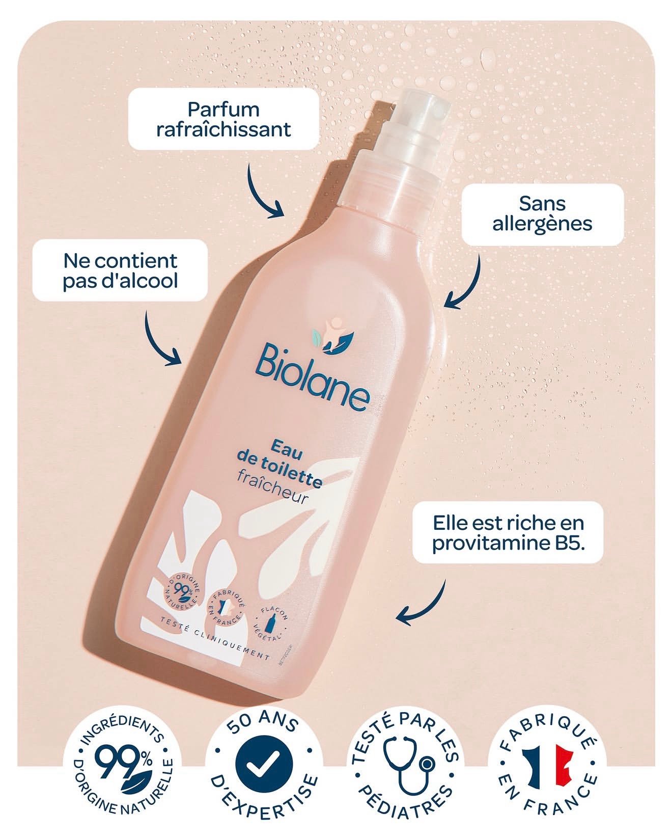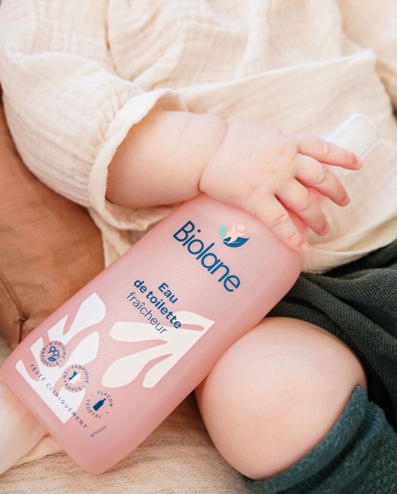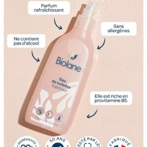 L’eau de toilette fraîcheur Biolane complète agréablement la toilette et rafraîchit votre bébé à tout moment de la journée.