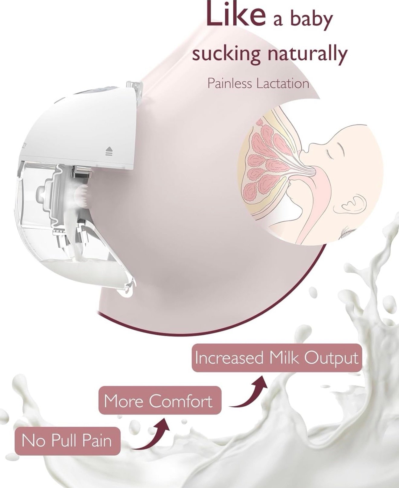 Le Momcozy M5 adopte un angle d’aspiration horizontal qui imite la position naturelle d’allaitement de votre bébé, plutôt qu’une traction vers le haut ou vers le bas, souvent inconfortable ou douloureuse.